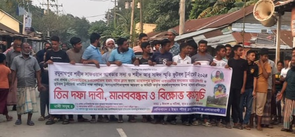 জামালপুর সদর উপজেলার রানাগাছা ইউনিয়নের চকবেলতৈল গ্রামবাসী ও ইয়াং স্টার কর্তৃক তিন দফা দাবী, মানববন্ধন ও বিক্ষোভ মিছিল অনুষ্ঠিত হয়েছে।মঙ্গলবার(০৫ নভেম্বর) বিকেলে স্থানীয় চকবেলতৈল  বাজারে এই মানববন্ধন ও বিক্ষোভ মিছিল অনুষ্ঠিত হয়।